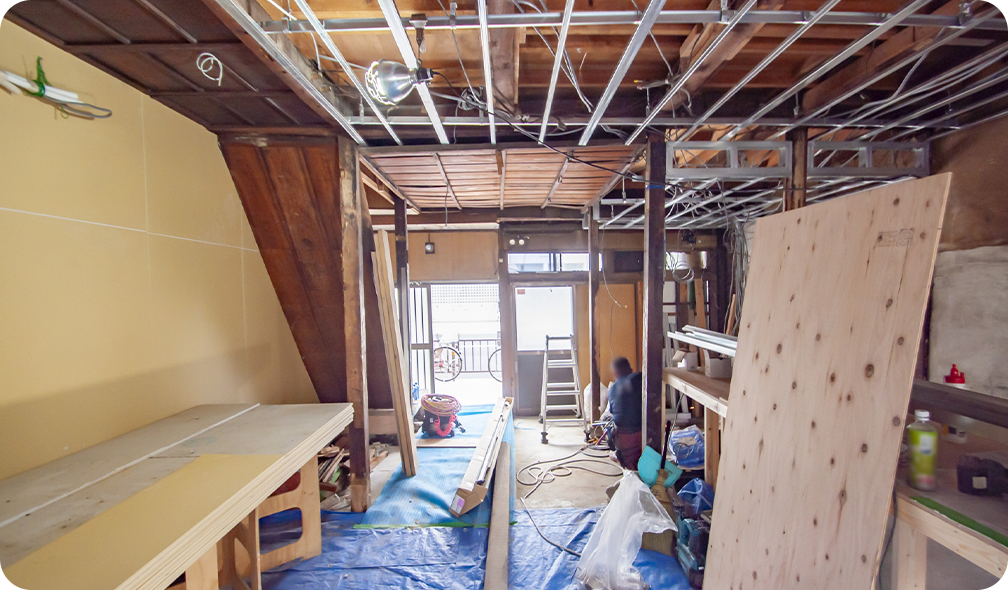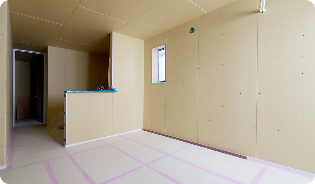 軽量鉄骨に石膏ボードなどを取り付け、壁や天井の下地を形成します。自社職人または当社専属の職人による丁寧な施工で、美しい仕上がりの基礎となる平滑で安定した下地を実現します。